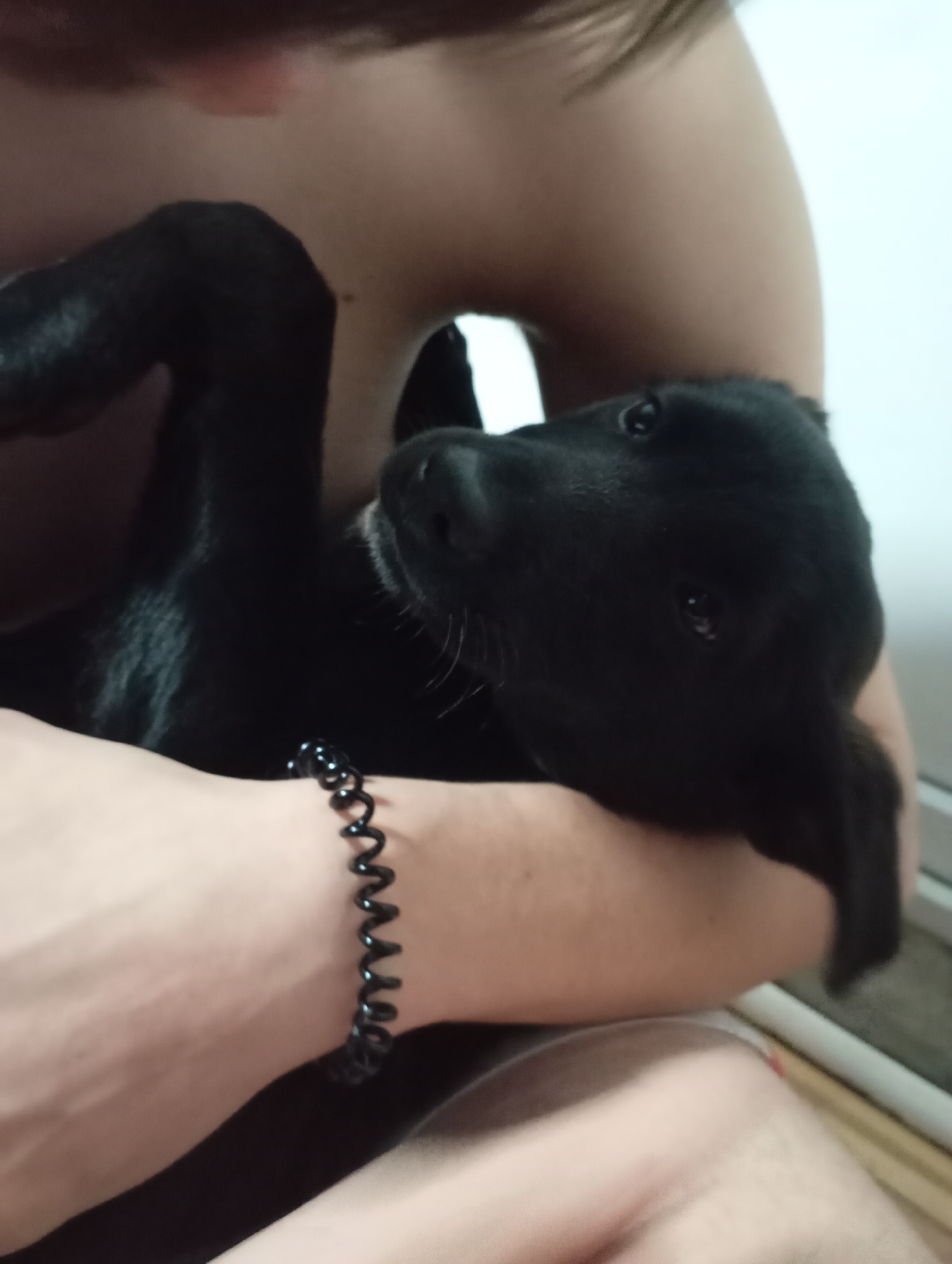 In an indoor setting within Kurganinsk, Russia, a person is observed holding a black puppy. The puppy, possessing short black fur and dark eyes, is positioned horizontally across the individual's torso, its head slightly elevated and facing the camera. The visible human elements include a light-skinned arm with a black spiral wristband, a portion of the upper body clad in a dark garment, and an out-of-focus lower body section. The background consists of a blurred, light-colored wall or interior surface.