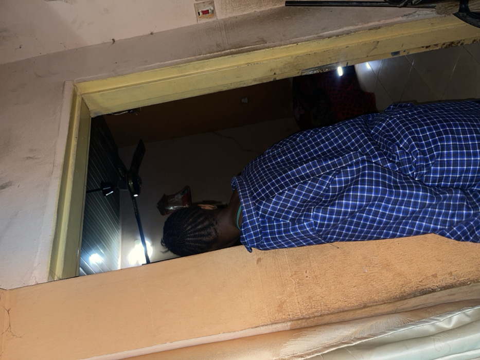 The scene depicts an interior view within a residential or domestic setting in Muchiya, Nigeria