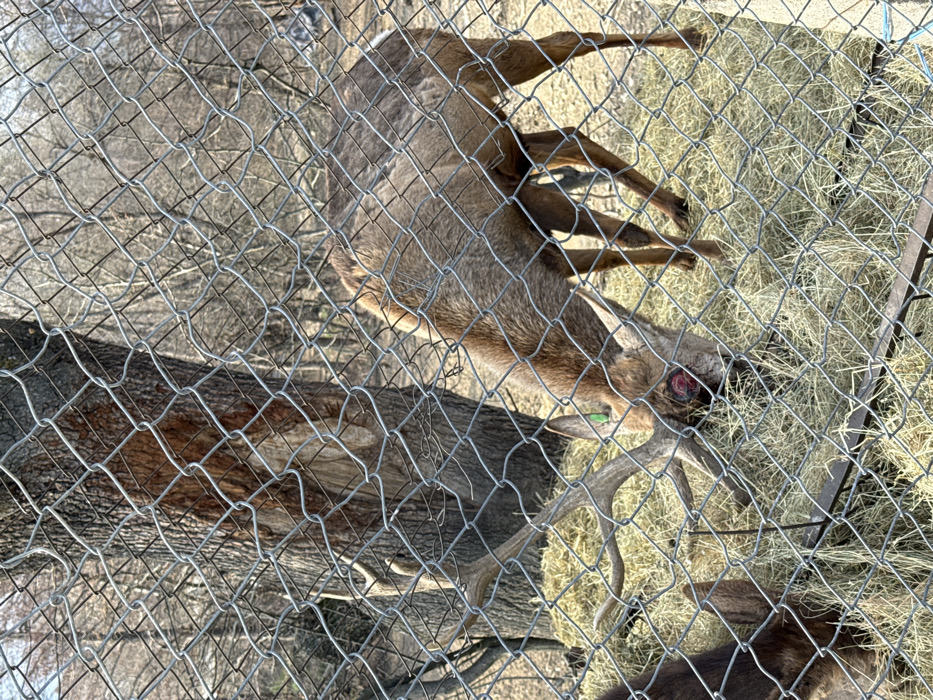 This image depicts an outdoor, fenced enclosure in the city of Krasnovo, Bulgaria, observed through a prominent chain-link fence. The primary subject is a male red deer, identifiable by its antlers, actively feeding on a pile of hay on the ground. The deer's right eye socket exhibits a notable red, swollen, and possibly prolapsed mass. A green identification tag is affixed to the deer's left ear. To the left, a portion of another deer's head and neck is visible, also engaged in feeding on the hay. In the background, beyond the enclosure, numerous deciduous trees with bare branches are visible, indicating a late winter or early spring season. The ground within the enclosure is covered with dry hay and sparse vegetation. No human subjects are present.