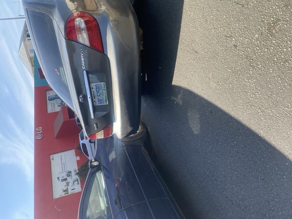 The image presents an outdoor scene on a clear, sunny day, characterized by sharp shadows on an asphalt road surface. In the midground, the rear of a grey Toyota Camry LE sedan is prominent, displaying a Nigerian license plate from Abuja: ABC-525BD. Positioned immediately to the left of the Camry's rear, the front-right side of a dark blue sedan is partially visible, in close proximity to the Camry's rear bumper; no damage is discernable on the Camry. The background features a large, red commercial building with significant white "LG" branding, identifying it as an LG electronics store. The building's facade includes large promotional displays for LG products, such as washing machines and televisions. Other building structures and minimal vegetation are visible behind the LG store. No individuals are present in the frame. This location is identified as the LG Electronics showroom at No. 1 Ahmadu Bello Way, Jos, Plateau State, Nigeria.
