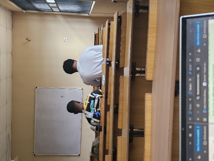 A classroom scene shows two students sitting at desks with attached writing surfaces. One wears a white shirt, while the other sports a patterned shirt. A whiteboard hangs on the wall behind them. Rows of empty desks extend to the right of the frame. A portion of a laptop screen is visible in the foreground, obscuring part of the image. The room is lit by overhead lighting, creating shadows and highlighting the wood grain of the desks.