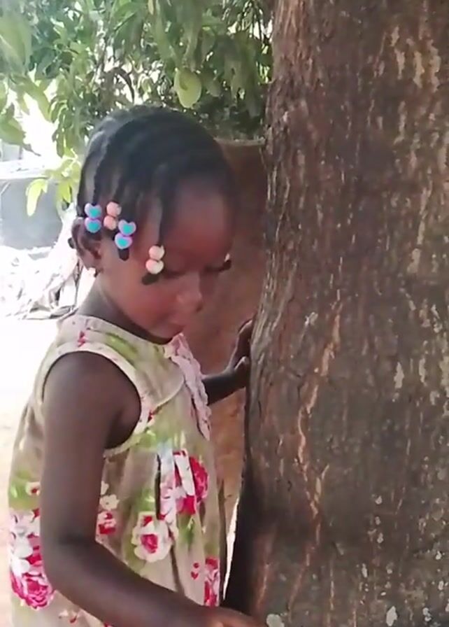 A young, dark-skinned child with braided hair stands beside a large tree trunk. The child is wearing a floral-patterned sleeveless dress with a ruffled collar, red socks, and pink shoes. Her hair is adorned with colorful bead decorations. She initially looks down at the tree trunk and then looks up at the camera, raising her hand slightly. The tree has a rough, textured bark with patches of lighter color. There are green leaves and a fruit visible in the background. A small portion of a brick wall is visible behind the tree. The ground is sandy and uneven.