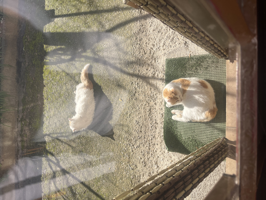 An overhead view captures an outdoor residential scene in Macedo de Cavaleiros, Portugal, illuminated by direct sunlight. In the foreground, a white and orange domestic cat is curled on a dark green rectangular doormat, appearing to rest with closed eyes. The bottom edges of the frame show partial views of light brown, slat-like material, possibly from a blind or barrier. Beyond the doormat, a light-colored ground surface, composed of small pebbles or gravel, extends into the midground. On this surface, a second domestic cat, predominantly white with ginger markings on its tail and head, lies stretched out on its side. Distinct shadows of unseen objects, consistent with sunlight filtering through an overhead structure or vegetation, are cast across the ground. A narrow strip of darker ground with minimal green vegetation is visible at the farthest edge of the scene. No human subjects are present.