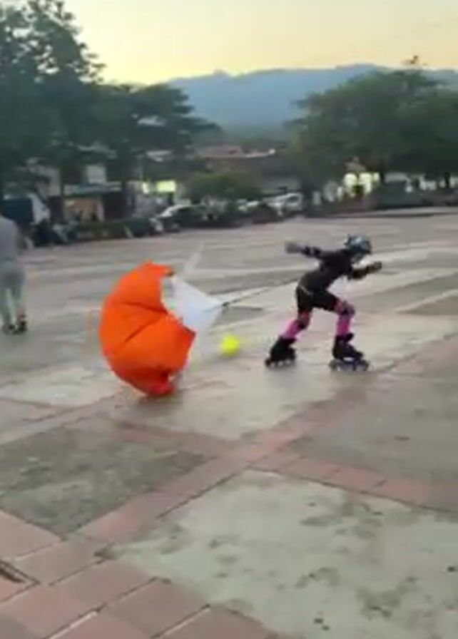 The video captures a person on roller skates, being pulled by a large orange windsock