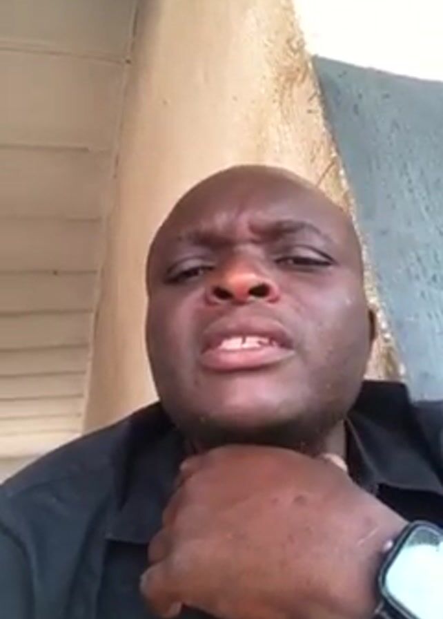 A man with a bald head and brown skin, wearing a black shirt and a watch, is recording a video message. He holds his hand to his neck and chin as he speaks. He is positioned under a porch or covered area, indicated by the beige planks above him. The background wall behind him is primarily beige with a strip of blue paint.