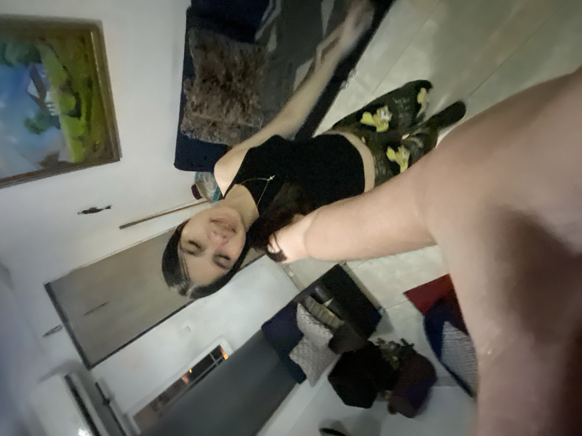 The image appears to be a selfie, taken from a skewed perspective. The visible room contains a framed painting hanging on a white wall, and a couch. A young woman wearing a black top is lying down, with a person’s arm largely obscuring the view. The location is not specified within the image and is not discernible.