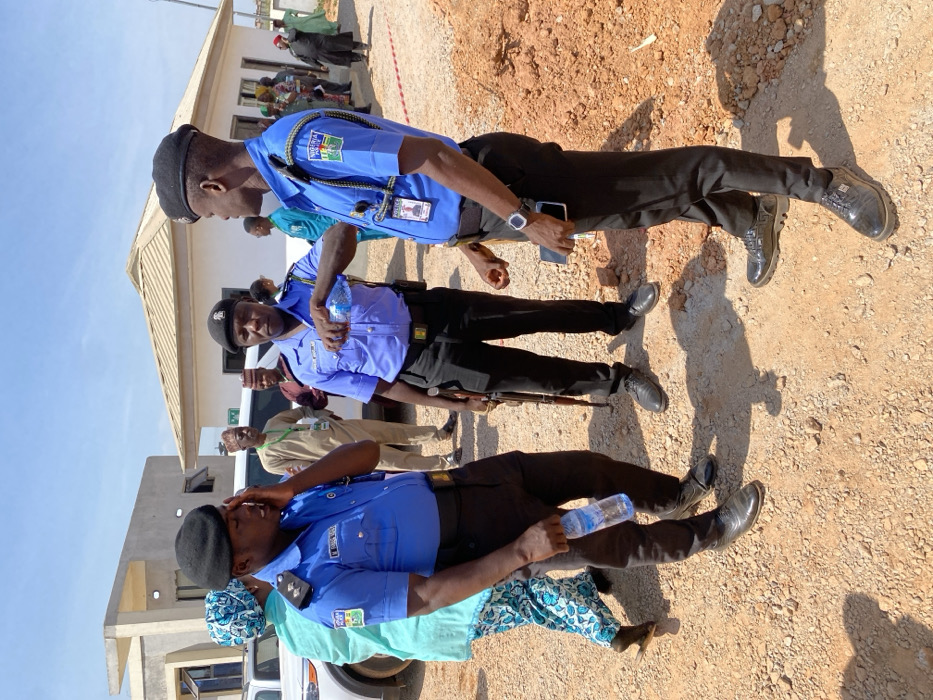 The scene depicts an outdoor gathering on reddish-brown gravelly ground under a clear sky in Gwagwada, Nigeria. Three male Nigerian Police Force officers are in the foreground. The officer on the left holds a clear plastic water bottle in his left hand; his right hand is near his face. The central officer is pouring water from a clear plastic bottle with his right hand, a rifle with a wooden stock slung over his left shoulder. The officer on the right holds a dark smartphone in his left hand and wears a dark wristwatch. All three officers wear blue short-sleeve uniform shirts with insignia, black trousers, black belts with gold buckles, and black berets. In the background, a white SUV is parked near a modern, multi-story concrete building. To the right, a smaller, white single-story building with a light-colored pitched roof is visible. Several civilians, including a woman in a patterned dress and men in traditional Nigerian attire, are present in the mid-ground and background. A red and white striped barrier tape is laid on the ground on the right side of the image.