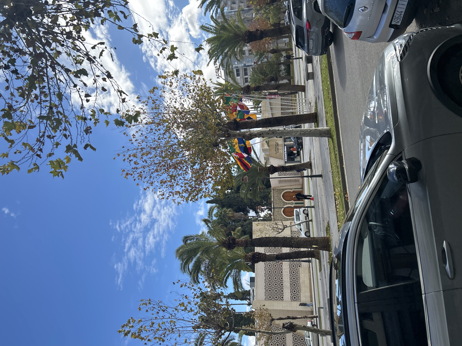 This daytime image depicts a bustling street scene in the Ville Nouvelle of Fez, Morocco, specifically along Avenue Hassan II, adjacent to the Wilaya de Fès-Meknès and near Place Florence. The sky is bright blue with scattered white cumulus clouds. In the immediate foreground, the grey side and front fender of a vehicle are visible on the left, with a partially obscured silver Renault hatchback parked behind it, displaying a Moroccan license plate "49644 | 19". Further down the street on the right, a grey SUV is parked. The scene features a wide, multi-lane street separated by a tree-lined median. On the far side of the street, a broad sidewalk or promenade is lined with mature trees, including tall palm trees and deciduous trees with sparse, autumn-colored foliage. Along the sidewalk, several individuals are present. One person, dressed in a dark jacket and red pants, is actively sweeping with a red broom or shovel. In the midground, a prominent display of various national flags is mounted on poles, signaling an international or official presence. A sign for "Au Gourmand Du Maroc" is visible on a building facade behind the flags, and further back, the word "ADENA" is partially visible on another building. The background is dominated by the distinctive architecture of the Wilaya de Fès-Meknès, characterized by a long, cream-colored wall featuring intricate geometric patterns, interspersed with arched entryways and dark wooden doors. Lush green foliage and more trees are visible behind this wall and surrounding buildings.