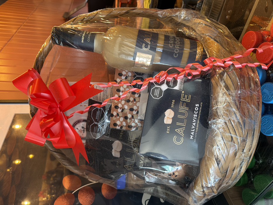 A gift basket is filled with various items including a bottle of "Calufo Crema Cordoba", and a box of "Calufo Malvaviscos"