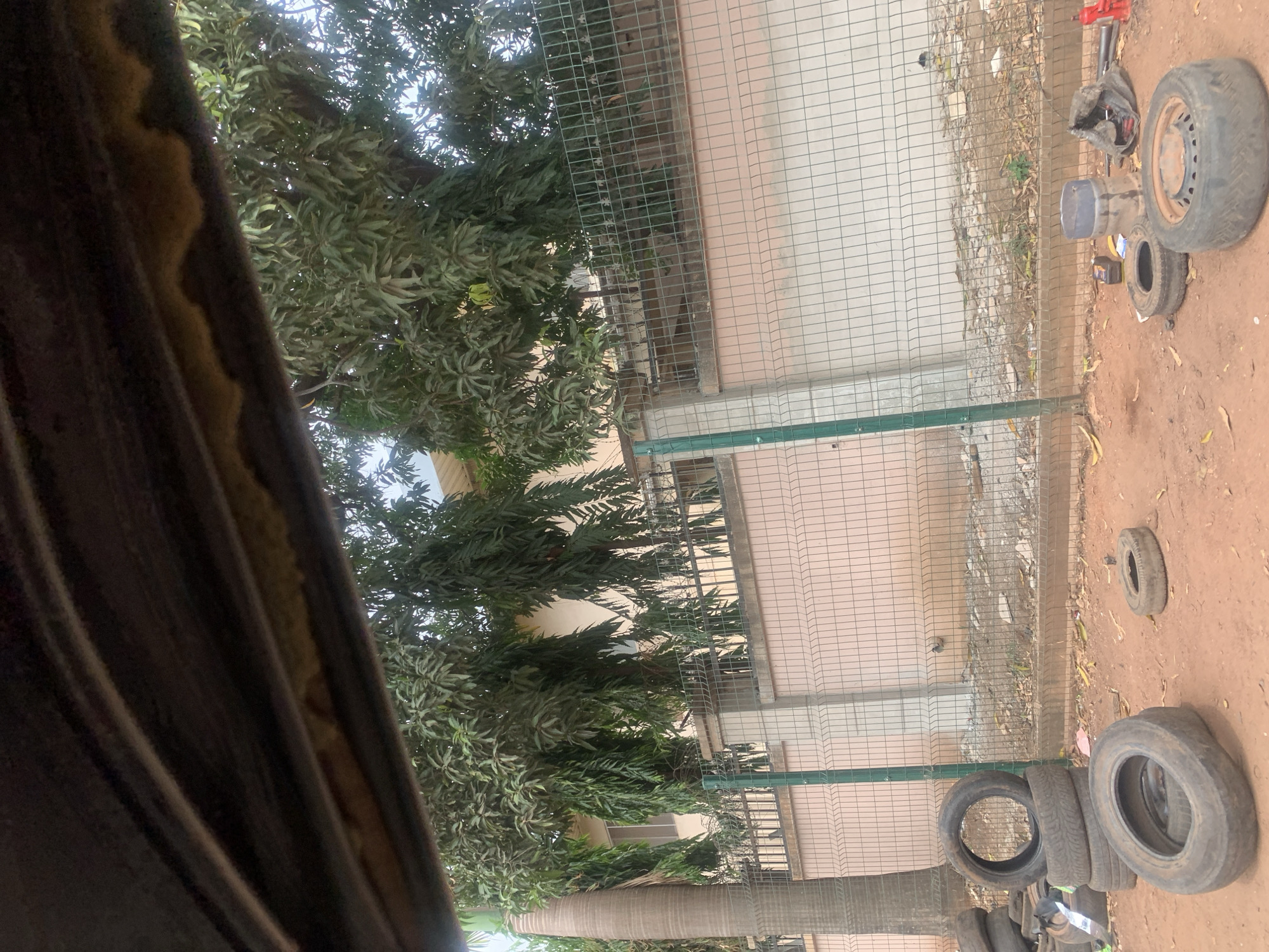 The image depicts an outdoor scene in Enugu, Nigeria, likely a roadside tire repair or sales point, viewed from the interior of a vehicle looking outward