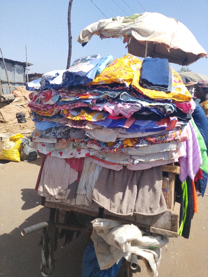 A wooden pushcart, overloaded with a dense, colorful stack of folded and draped textiles, is positioned centrally on an unpaved thoroughfare in Sabon Tasha, Nigeria