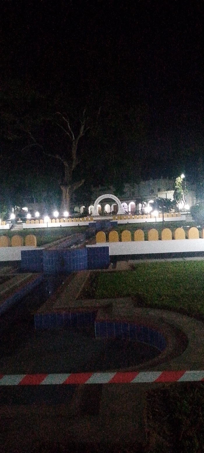 The image captures a public park or landscaped area in Tudor ward, Kenya, at night, devoid of people. Artificial lighting illuminates the scene. In the immediate foreground, a red and white striped barrier tape extends horizontally across a dark, possibly grassy or unpaved surface. The midground features a tiered landscape design with patches of green grass, interspersed with blue-tiled structures that appear to form decorative walls or water features. Behind these, a light-colored low wall or barrier is topped with uniformly spaced, rounded, yellow-orange decorative elements. A row of bright, spherical lights on poles provides significant illumination, highlighting a prominent white architectural structure featuring multiple archways, resembling a colonnade, in the background. To the left, a large, bare-branched tree stands against the night sky. Additional buildings and vegetation are vaguely visible behind the illuminated structures. The sky is dark.