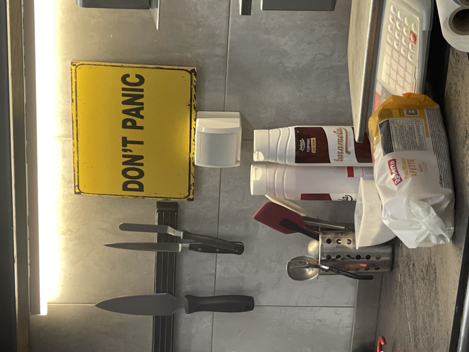 This image depicts a commercial food preparation area located in Budva, Montenegro. The scene features a light grey tiled wall illuminated by a horizontal fluorescent light fixture at the top. On the wall, from left to right, three kitchen implements—a wide spatula-knife, a pointed chef's knife, and a narrow spatula—are magnetically attached to a dark horizontal strip. To their right, a distressed rectangular yellow sign with a black border displays the capitalized text "DON'T PANIC" in black lettering. Below this sign, a small white rectangular object, possibly a sensor, is mounted on the wall. On the dark countertop below, a metallic cylindrical utensil holder contains various kitchen tools, including a red spatula, a metal ladle, and tongs. Next to the holder, a small white square bowl is present. Further to the right, two squeeze bottles stand; the left one is white with a partially obscured label, while the right bottle is brown and white, labeled "Select TOPING TOP SHOP" and "karamela" (caramel). In the foreground, a white plastic-wrapped package labeled "Roberto Pane Morbido A FETTE" (soft sliced bread), indicating a net weight of "e 400g," rests horizontally. To the far right, a silver digital commercial scale with a white keypad featuring multiple square buttons and a display screen is visible, alongside a partially seen roll of white material. No individuals are present in the image.