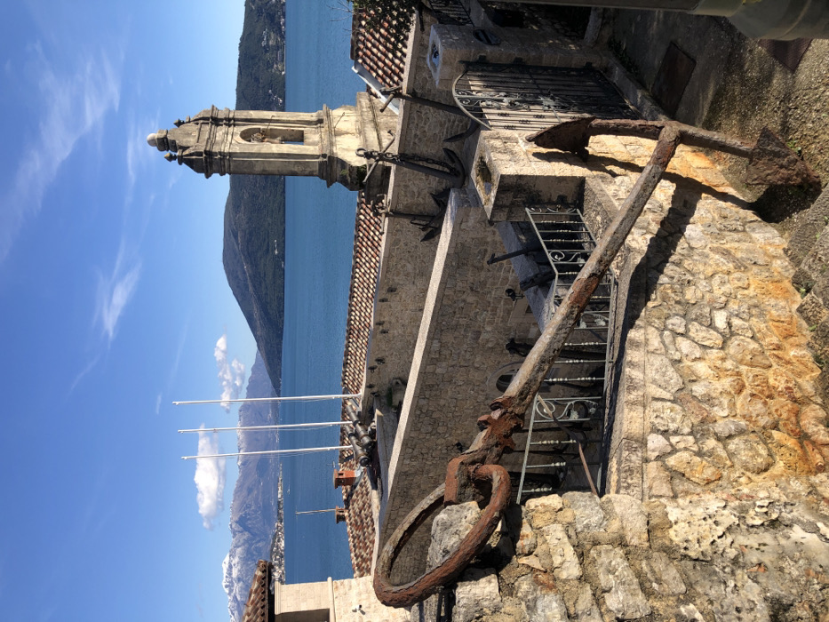 The image displays an elevated view of a coastal scene in Herceg Novi, Montenegro, under clear blue skies with scattered white clouds. The foreground is dominated by a large, heavily rusted ship anchor, positioned diagonally across a textured stone wall. The anchor's ring is visible at the upper left, while its shank extends downwards to the right, with a portion of its fluke resting near a stone step. Sunlight from the upper left casts a distinct shadow of the anchor onto the stone wall and pathway below. Below this foreground wall, a midground area features a courtyard or terrace enclosed by additional stone walls. Several smaller, dark-colored anchors are displayed upright against these walls. A pair of ornate, black metal gates with decorative scrollwork provides access on the right. To the right, a weathered, light-colored stone bell tower, or campanile, stands prominently, containing a small bell within one of its arched openings. Three tall, white flagpoles, devoid of flags, are visible on a lower platform or rooftop. Two dark cannons are positioned on a wall, facing the body of water. Red-tiled rooftops of unseen structures are visible in this section. The background consists of a wide expanse of deep blue water, likely the Bay of Kotor. Beyond the water, a large, forested mountain range, appearing dark green, occupies the right side of the horizon. Further to the left, a range of snow-capped mountains is visible in the far distance under the bright blue sky. No individuals are present in the scene.