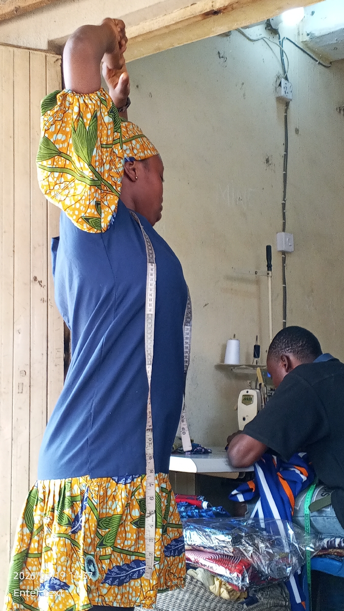 An interior view of a tailoring workshop in Gama, Nigeria, displays two individuals engaged in garment-making activities