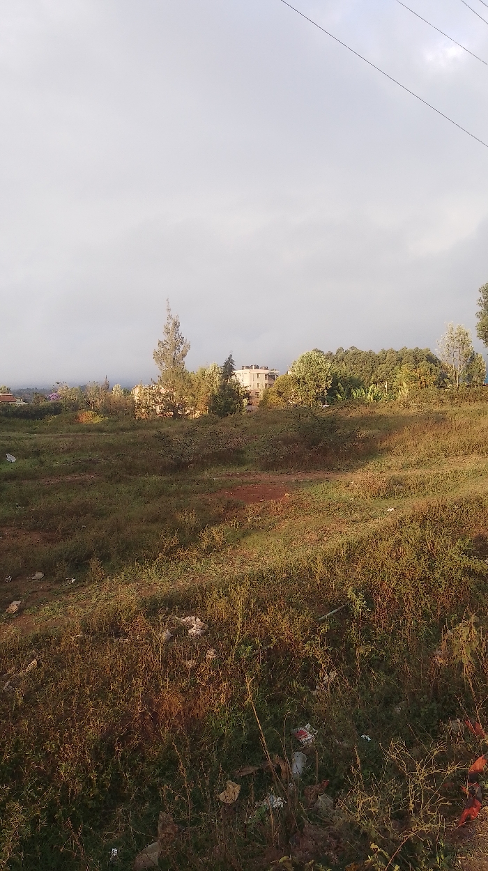 A landscape shows an overgrown field in the foreground, filled with tall grasses and scattered debris. Beyond the field, there are buildings surrounded by trees. The sky is overcast with thick clouds. Several power lines stretch across the upper part of the image. The light suggests it could be either sunrise or sunset.