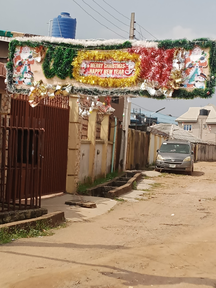 The image captures a street scene in Iju, Nigeria, featuring an unpaved dirt road under a hazy sky. A large rectangular banner, adorned with green and white tinsel, depictions of Santa Claus and snowmen, and the central text "MERRY CHRISTMAS HAPPY NEW YEAR" framed in gold tinsel, hangs overhead. To the left, a tall, brown metal gate provides access to a property, adjacent to a cream-colored wall topped with barb wire. An open concrete drainage channel runs along the wall's base, with several concrete covers positioned on the ground. A grey minivan with minor front bumper damage is parked facing forward on the right side of the dirt road. In the background, residential buildings with varying rooflines and multiple rooftop water tanks, including a prominent blue one, are visible. No people are present.