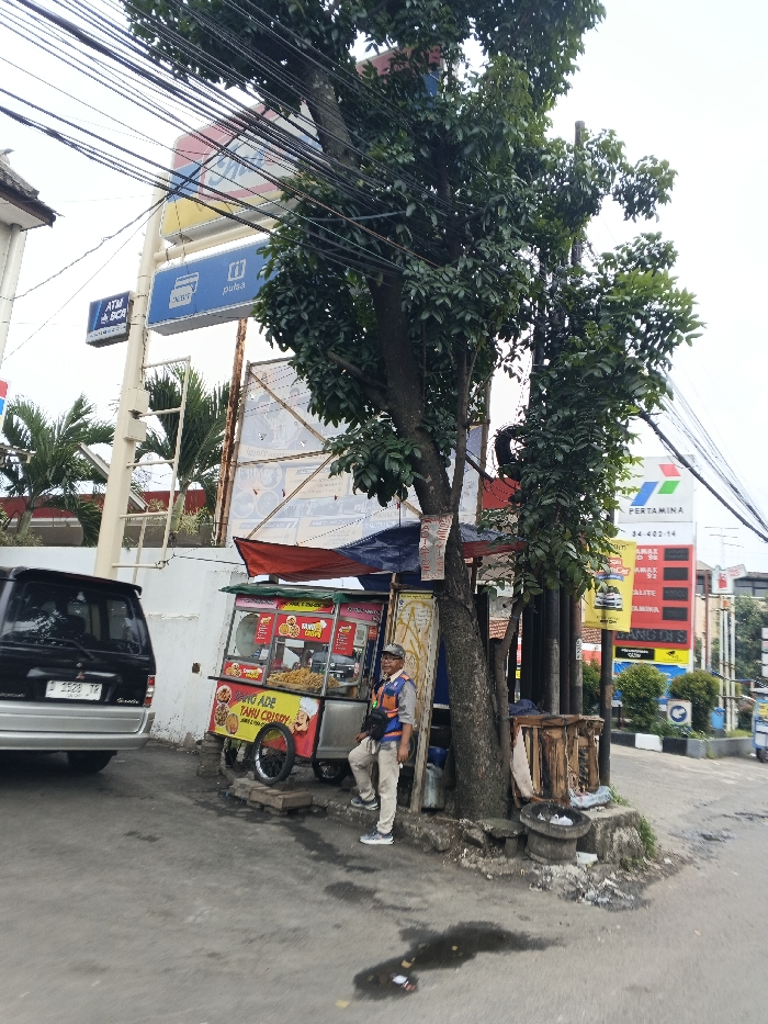 A man stands next to a food cart offering "Tahu Crispy," beneath a tree. Overhead, power lines cross the sky. Behind the cart is a weathered advertisement board, and a white wall. A black car is parked on the left. In the background, signage for an ATM, "Pulsa," and a gas station, "Pertamina," are visible, along with various other signs. The street is asphalt, and there are puddles on the road near the curb.
