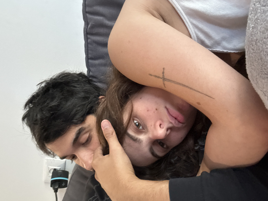 The image portrays two individuals, a male and a female, in an indoor residential setting in Givatayim, Israel. The female is in the foreground, positioned on her back or side, looking directly at the viewer. She has brown, curly hair, an olive complexion with visible freckles or moles on her face, and is wearing a light-colored tank top. A black, stylized sword tattoo is visible on her left upper arm. The male is situated behind and slightly above her, with his head turned downwards and to his right, largely in profile. He has dark, wavy hair and an olive complexion, wearing a dark long-sleeved garment. His right hand rests on the female's head, partially obscured by her hair. Both individuals appear to be resting on a grey upholstered surface, likely a sofa or bed. A light grey blanket or textile is visible in the lower right corner. In the background, a white wall features a white electrical outlet with a black and blue electrical adapter plugged in, from which a black cable extends towards the left. The scene is illuminated by ambient, diffused light.