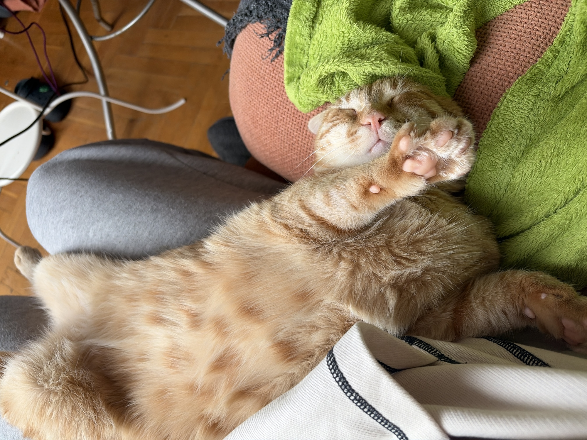 A photograph shows an orange tabby cat sleeping on a surface covered with several items. The cat is lying on its back with one paw raised towards its face, which is nestled against a fluffy green blanket. The cat's belly is visible, displaying a striped pattern. A white cloth with black stitching along the edge is located beneath the cat. In the background, there is a chair with an orange cushion and a grey-covered surface. The floor is made of wooden planks. There is no indication of the location being in Sofia, Bulgaria.