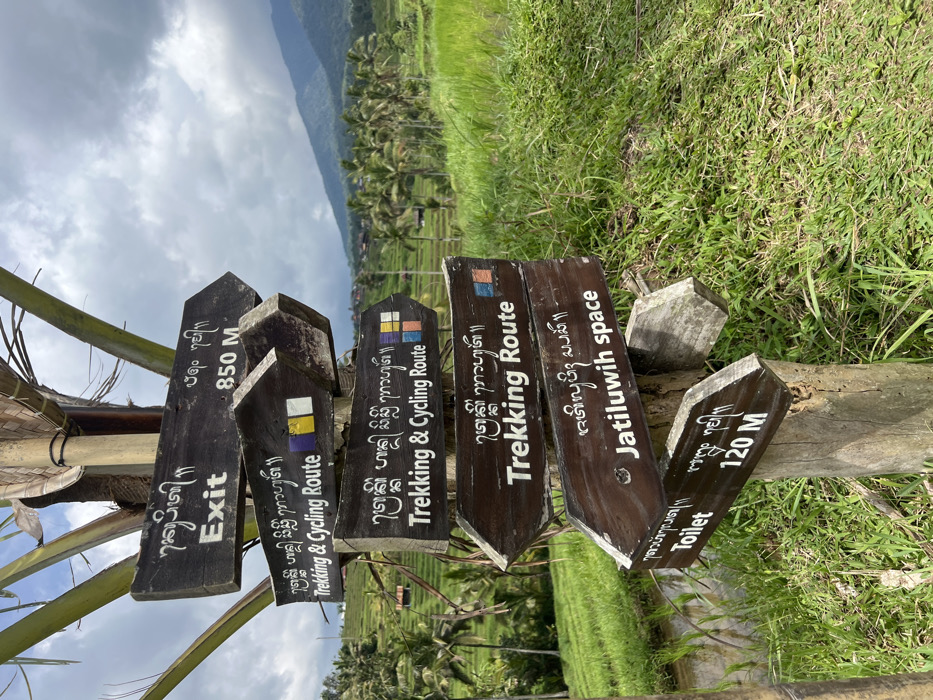 A cluster of weathered wooden signs in a lush outdoor setting. One sign points to "Exit" and indicates "850 M," while others direct towards "Trekking & Cycling Route" and "Trekking Route." Another sign identifies "Jatiluwih space," alongside Balinese script on each. Finally, a smaller sign indicates "Toilet" and "120 M," suggesting proximity. The background reveals a landscape of green foliage and a cloudy sky.