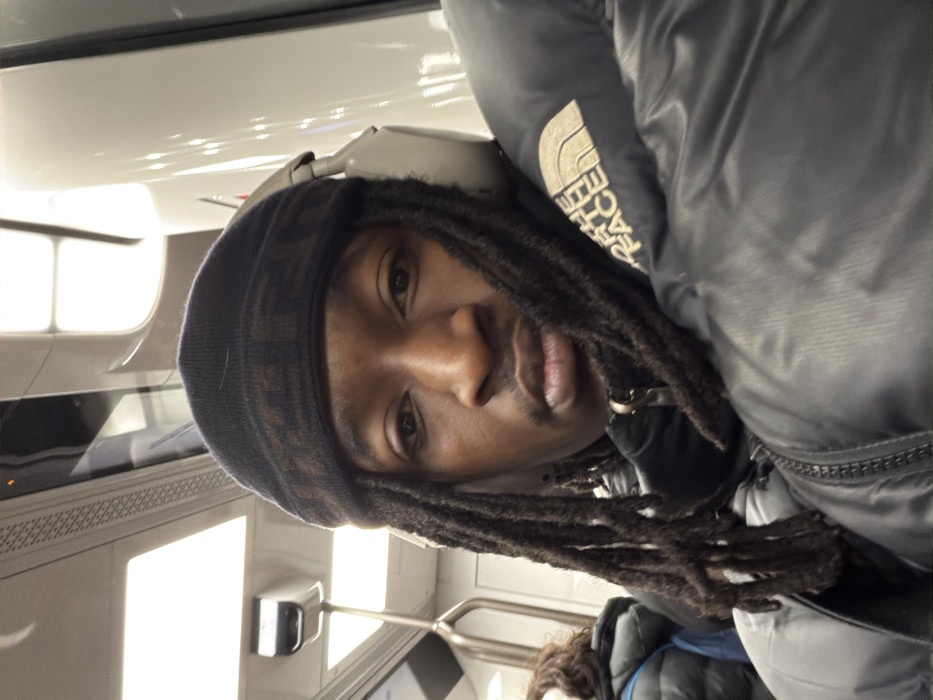 A male individual with dreadlocks, a mustache, and a dark complexion is depicted from the chest up, looking directly at the camera. He wears a dark knit beanie with a repeating pattern, light gray over-ear headphones, and a black puffer jacket featuring a tan "The North Face" logo on the left shoulder. The scene is set inside a modern public transport vehicle, specifically consistent with an RER A train in Paris, France, identifiable by the distinctive overhead rectangular white lights, curved white interior panels, and silver vertical grab poles. Another individual, partially visible and blurred, is seated behind and to the left of the main subject, wearing a dark blue puffer jacket. The lighting is bright and artificial.