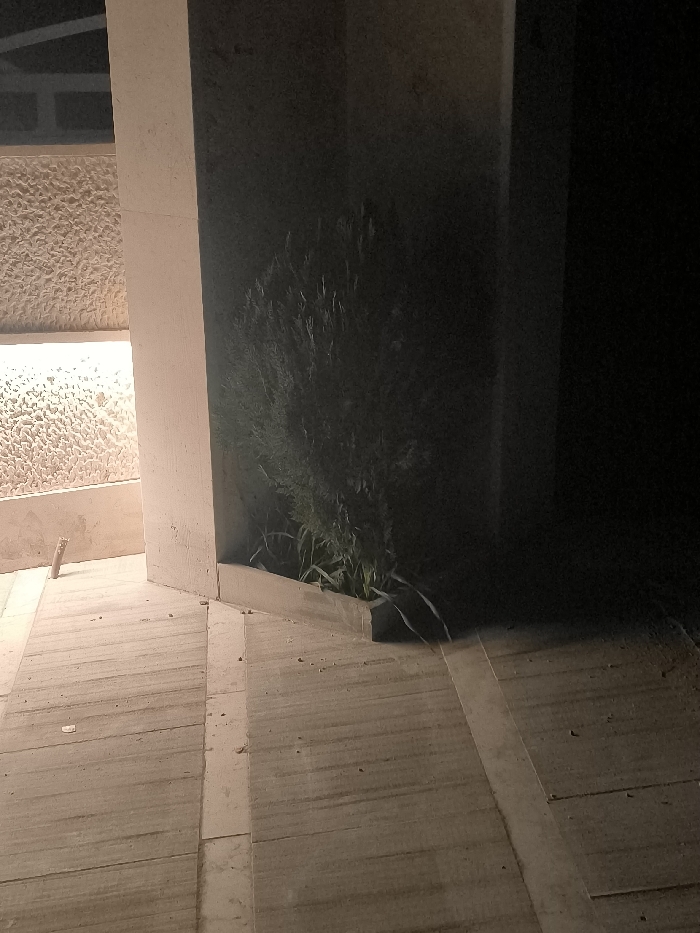 A dark, dimly lit outdoor scene. A beige stone pillar stands beside a bush in a planter, casting a shadow to the right. Light reflects off the nearby textured wall, and continues onto the stone tiled path and steps in the foreground. The right side of the frame fades into darkness.