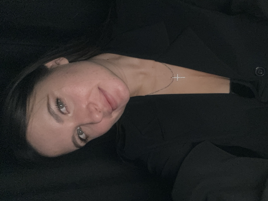 A single female subject is depicted in a close-up portrait, located in the City of Unknown, Russia. She possesses long, dark hair, parted on her left, and green/hazel eyes, with her head slightly tilted and a subtle smile directed at the camera. The subject is wearing a dark blazer over a dark inner garment. A silver-colored chain necklace with a cross pendant, embellished with small reflective stones, is prominently displayed on her décolletage. The background is uniformly dark, providing no discernible features and suggesting an indoor or controlled lighting setting.
