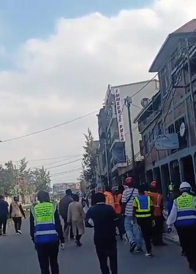 A group of people are walking down a street lined with buildings on both sides. Many of the people are wearing bright vests that are either green, yellow, or blue. Some of the vests have writing on them. Some people are carrying bags. A few people are standing on the side of the street. There are power lines running over the street. The sky is cloudy.