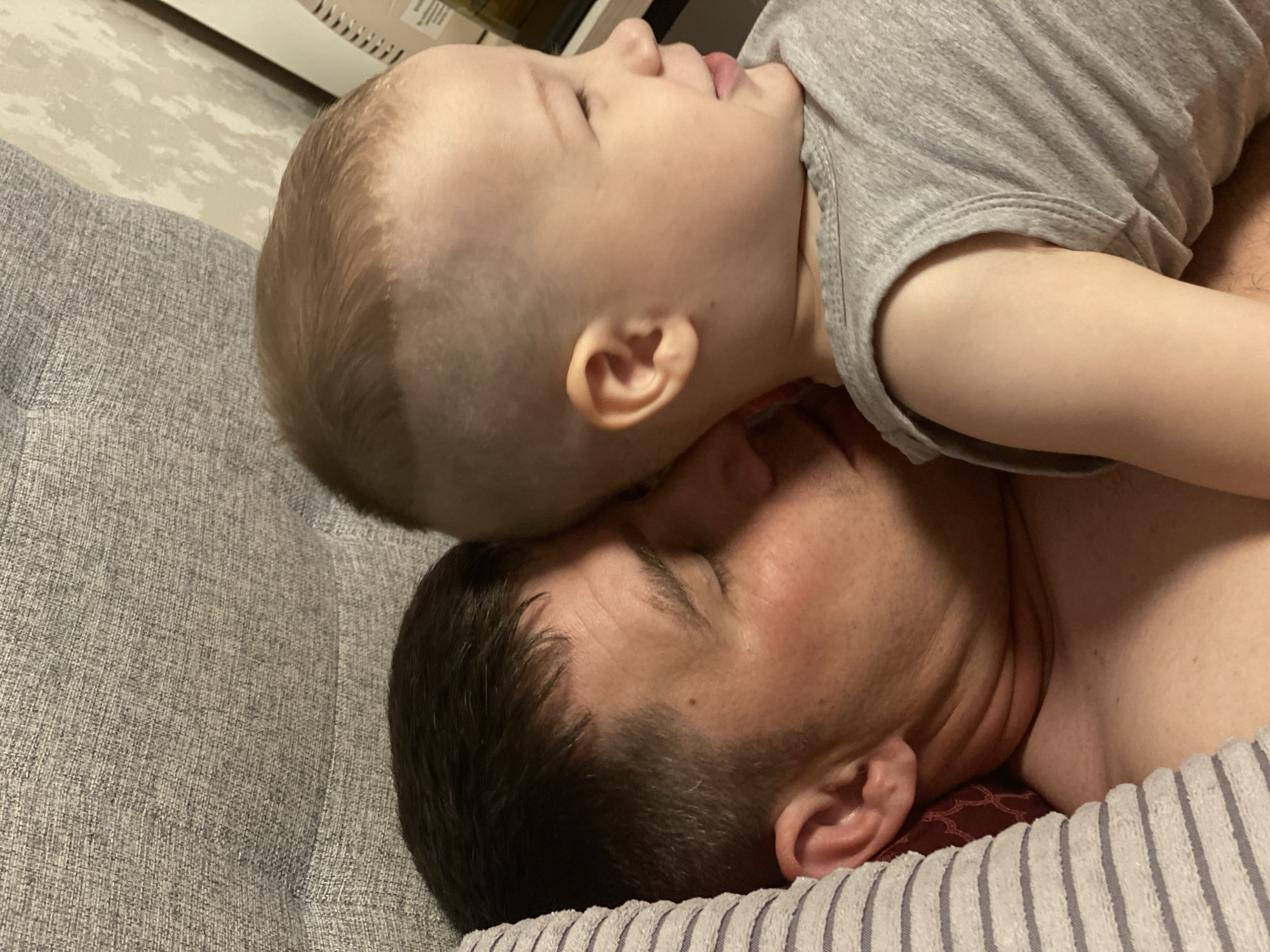 A man and a young child are depicted in a close-up, intimate moment. The man is lying on his back, his head resting on a pillow with a striped pattern. The child is lying on top of the man, with the child's head resting on the man's forehead. The child is wearing a grey shirt. The man has short dark hair and closed eyes. The background includes a grey textured sofa and what appears to be a white appliance or furniture piece. There is no indication in the image that the location is Sochi, Russia.