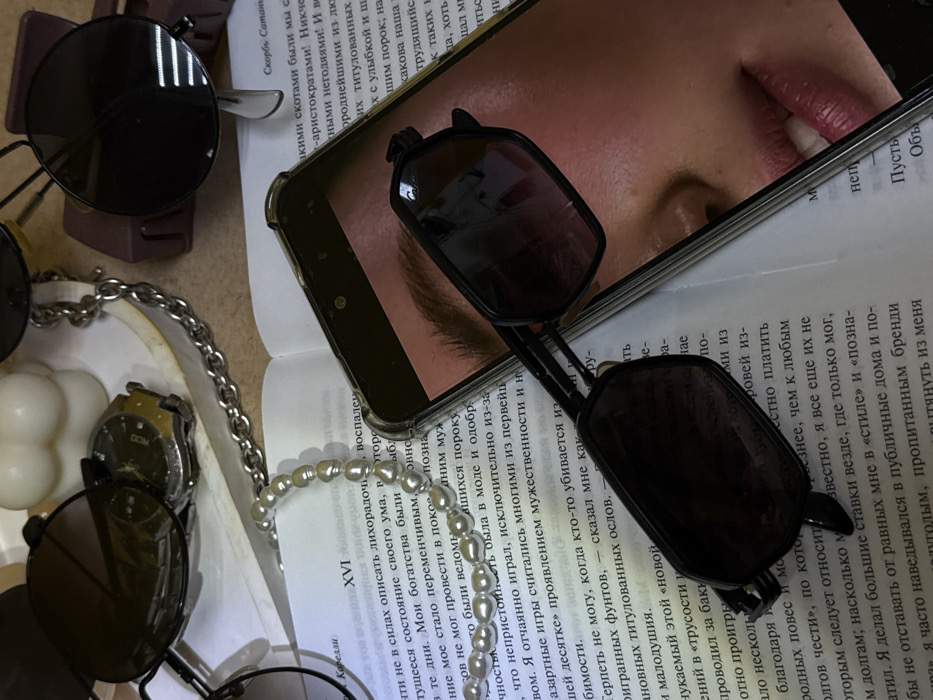 The image presents an overhead view of a collection of personal items arranged on an open book and a light-colored surface in Unknown, Unknown. Centrally, an open book displays white pages with black Cyrillic text. A smartphone in a clear case rests on the book's right page, its screen showing a close-up of a human face, specifically the right eye, eyebrow, upper cheek, nose, and lips, featuring a reddish complexion. A pair of black, angular sunglasses with dark lenses lies partially across the smartphone screen and the book. To the left, a strand of off-white, irregularly shaped pearls is draped over the book's left page and the adjacent surface. Nearby, two more pairs of sunglasses are visible: one with round, dark lenses and metal frames, and another with rectangular black lenses. A gold-toned wrist watch with a circular dial and matching band is partially obscured beneath the round sunglasses. Further left, a white, rounded decorative object, resembling a candle or sculpture, is present. A silver-colored chain extends across the upper left area. In the upper right, a fourth pair of round, dark-lensed sunglasses rests on a dark brown, rectangular object. The scene is static, depicting a staged arrangement of accessories.