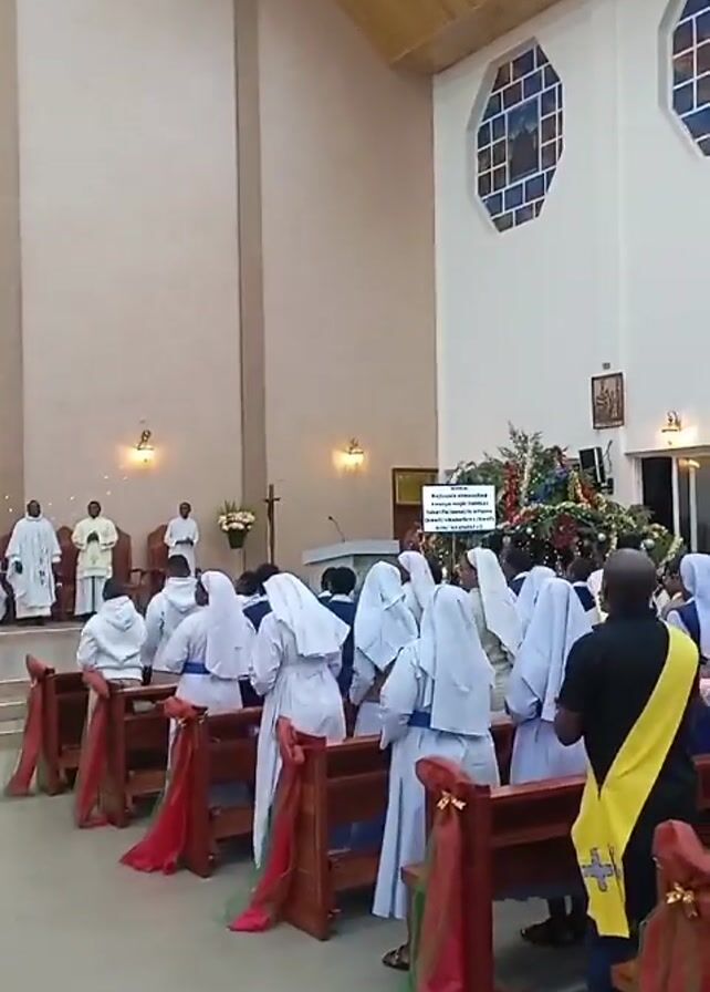 interior of what appears to be a church. A group of people dressed in white robes and blue sashes are standing in the pews, facing towards the front of the church. Several men dressed in white clerical robes are standing at the front of the church. To the right of the congregation is a decorated area, possibly an altar or display. The church has high ceilings and large windows. The pews are decorated with red and green fabric. One man is standing next to the pews wearing a black shirt and yellow sash. People appear to be singing or chanting.