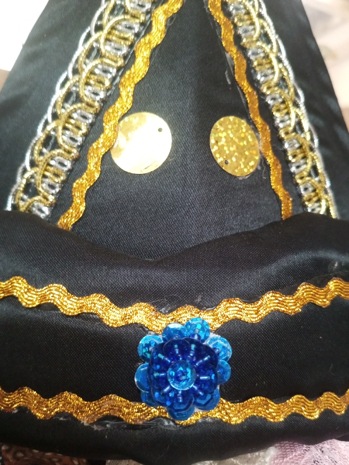 A close-up shows a black fabric, possibly part of a hat or costume. It's decorated with gold and silver trim. Two round gold sequins are placed near the top. A blue, flower-shaped embellishment adorns the lower section, bordered by gold rickrack. The fabric appears to be shiny and slightly wrinkled.
