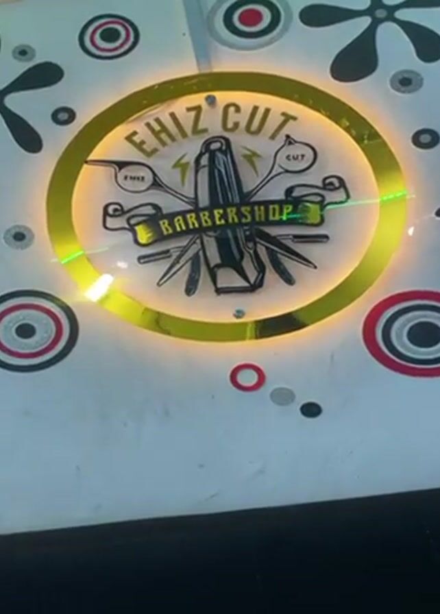 close-up of a barbershop sign on a white wall. The sign is circular with a gold border. Inside the circle, the words "EHIZ CUT BARBERSHOP" are displayed in a stylized font. The logo includes images of scissors, a comb, and a razor. The wall is decorated with various geometric shapes and designs, including circles and star-like figures. There is also a green LED strip lighting at the top of the wall.