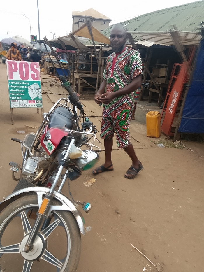 An outdoor street scene in Nsugbe, Nigeria, captures a man standing next to a motorcycle on a reddish-brown dirt ground