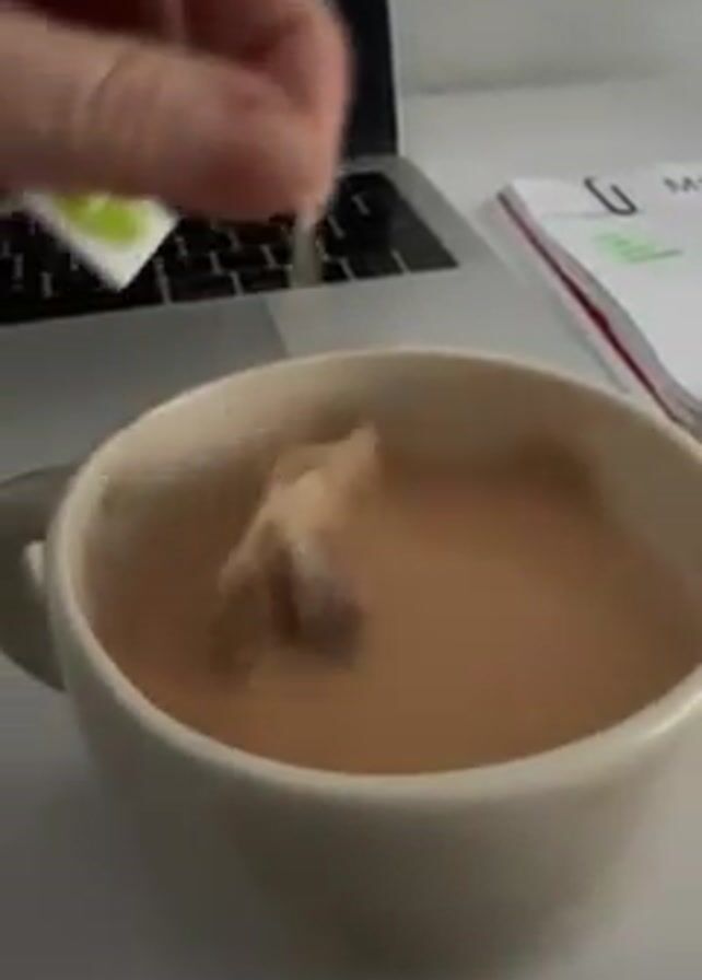 A hand dips a teabag in and out of a mug of milky tea. A laptop and notepad are visible in the background. The scene takes place on a white desk.