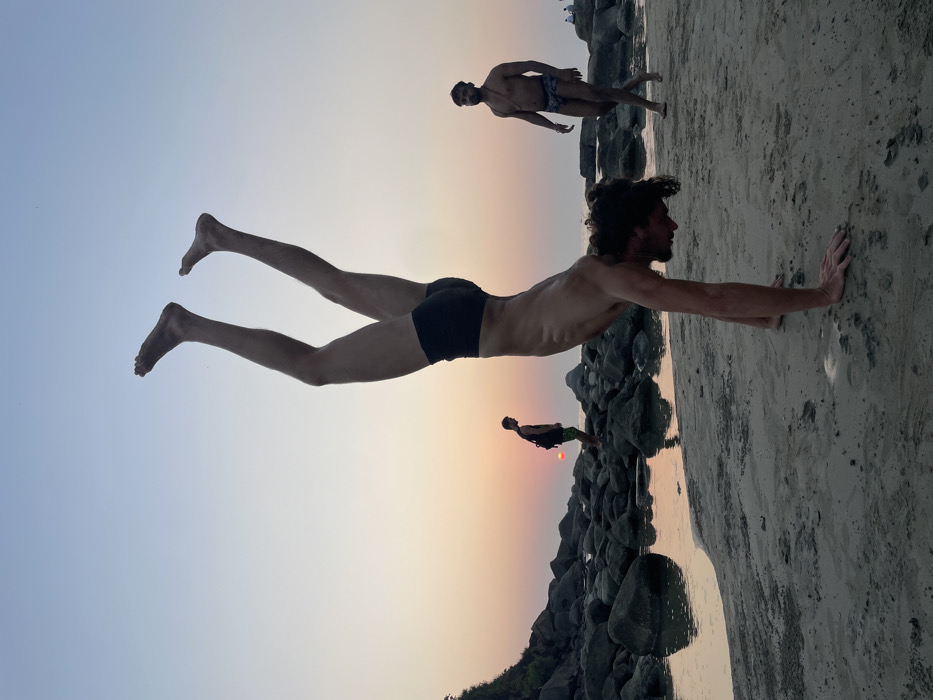 The image depicts a beach scene in Kolamb, India, at sunset. In the mid-foreground, a lean male individual with dark, curly hair performs a handstand on damp, dark sand. He is shirtless and wears dark swim trunks, with his hands supporting his body and legs extended vertically upwards. To the left, another male individual, largely silhouetted, walks leftward across a rocky section of the beach. He wears shorts and a dark backpack, with an orange spherical object visible near his lower back, coinciding with the setting sun. Water partially fills the rocky area, reflecting the sunset. To the right, a third male individual with darker skin and a beard walks rightward in the mid-ground. He is shirtless and wears dark, patterned swim briefs. The environment includes a coastline composed of dark, wet sand giving way to numerous large, smooth, dark boulders. Calm water reflects the sky's colors amongst these rocks. A dark, vegetated cliff or landmass is visible on the far left. The sky displays a gradient from light blue overhead to orange and pink at the horizon, indicating the sun's low position during sunset.