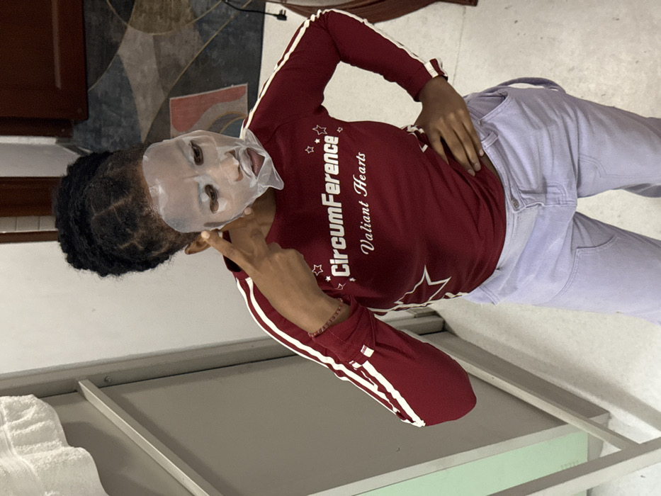 A individual, identified as a young adult female, is depicted indoors, likely within a private residence. Her face is covered with a translucent sheet mask. She is wearing a long-sleeved maroon shirt with white stripes on the sleeves and the text "CircumFerence Valiant Hearts" with stars printed on the chest. She wears light lavender-colored pants. Her right index finger is pointed towards her right temple, while her left hand rests on her hip. Her dark hair is styled in braids pulled up. The background features a light-colored wall, a white towel hanging on a metallic rack to the left, and a darker wooden door frame with a patterned rug visible on the floor to the right. A black electrical cord and a white plug are visible on the floor near the right. The floor is light-colored. The specific location within Daxing District, China, cannot be determined from the visual information provided.