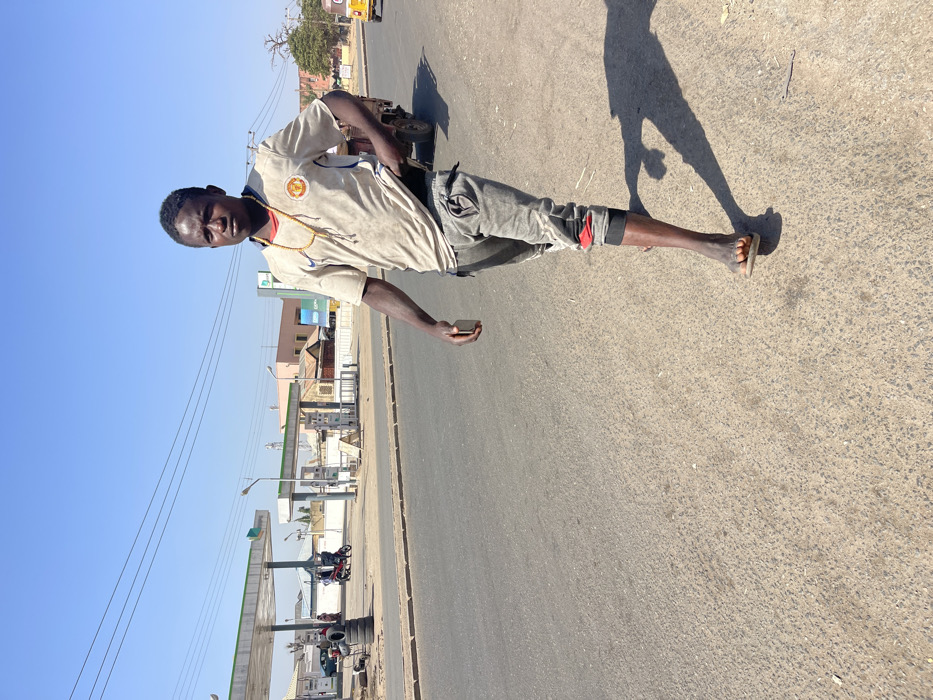 A young adult male walks on the dirt shoulder of an asphalt road in Hanwa, Nigeria, under a clear, bright blue sky