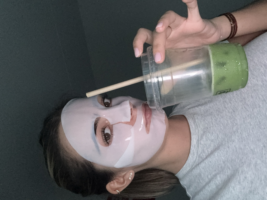 A female individual is depicted in a close-up, chest-up shot, looking directly at the camera. She has a white or pale blue sheet face mask applied to her face, covering her forehead, cheeks, and chin, leaving her eyes, nostrils, and mouth exposed. Her visible eyes are dark brown. She has multiple small earrings in her left ear, including a hoop and three studs. Her hair, dark in color, is pulled back and partially visible behind her left ear. She is wearing a plain light grey t-shirt. With her right hand, she holds a translucent plastic cup containing a vibrant green liquid with ice cubes, and a light-colored straw inserted. The cup has a faint, dark green logo on its lower side. Her fingernails are painted a light pink. On her right wrist, several thin, dark-colored bracelets are visible. The background is uniformly dark and nondescript, providing no discernible features or specific location identification.