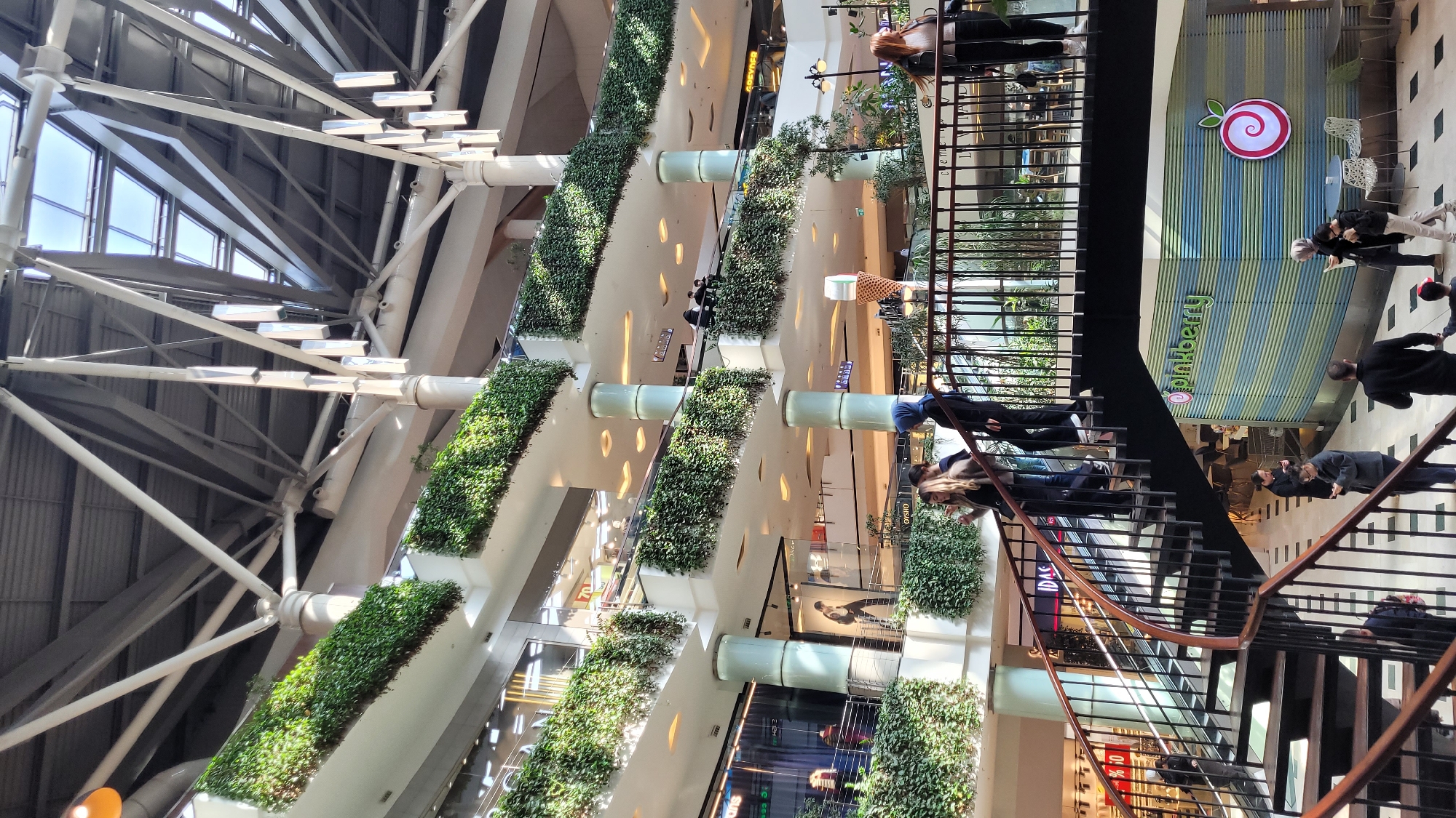 This is an interior shot of a shopping mall in Başakşehir, Turkey. The architectural design features a high ceiling supported by a white steel structure with skylights. Several floors are visible, each lined with green plants in raised planters that decorate the edges. Shoppers are seen on stairs, and storefronts of various shops and businesses are visible below. A Pinkberry store is also seen, with its distinct logo.