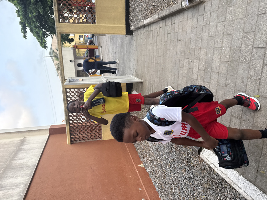 Two school-aged boys are on a sidewalk outdoors. One boy wears a yellow shirt, red shorts, and a small black bag. He is holding a case and looking at the camera. The other boy wears a white jersey and red shorts, carrying a backpack and a lunchbox. Both boys have matching logos on their shorts. In the background, two other people walk through an open gate toward a street with parked cars. The sky is overcast.