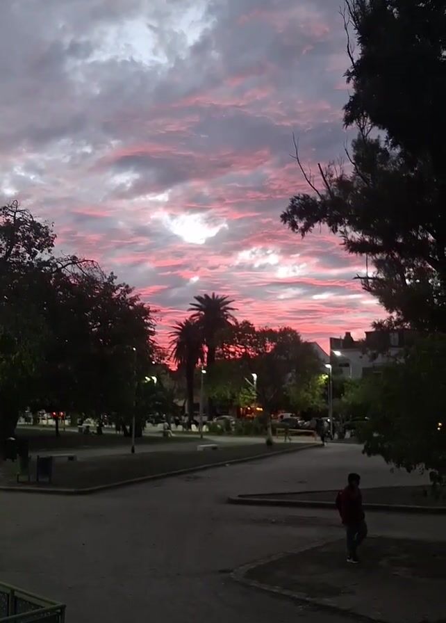 low-angle view of a park or town square at dusk or dawn. The sky is filled with pink-tinged clouds, with a brighter area suggesting the sun's position. Silhouetted trees, including palm trees, frame the scene. Street lights illuminate the park's walkways. A person walks across a sidewalk in the foreground. Buildings can be seen in the background. Someone says, "Más tarde se con tormenta electrica," which translates to, "Later there will be an electrical storm."