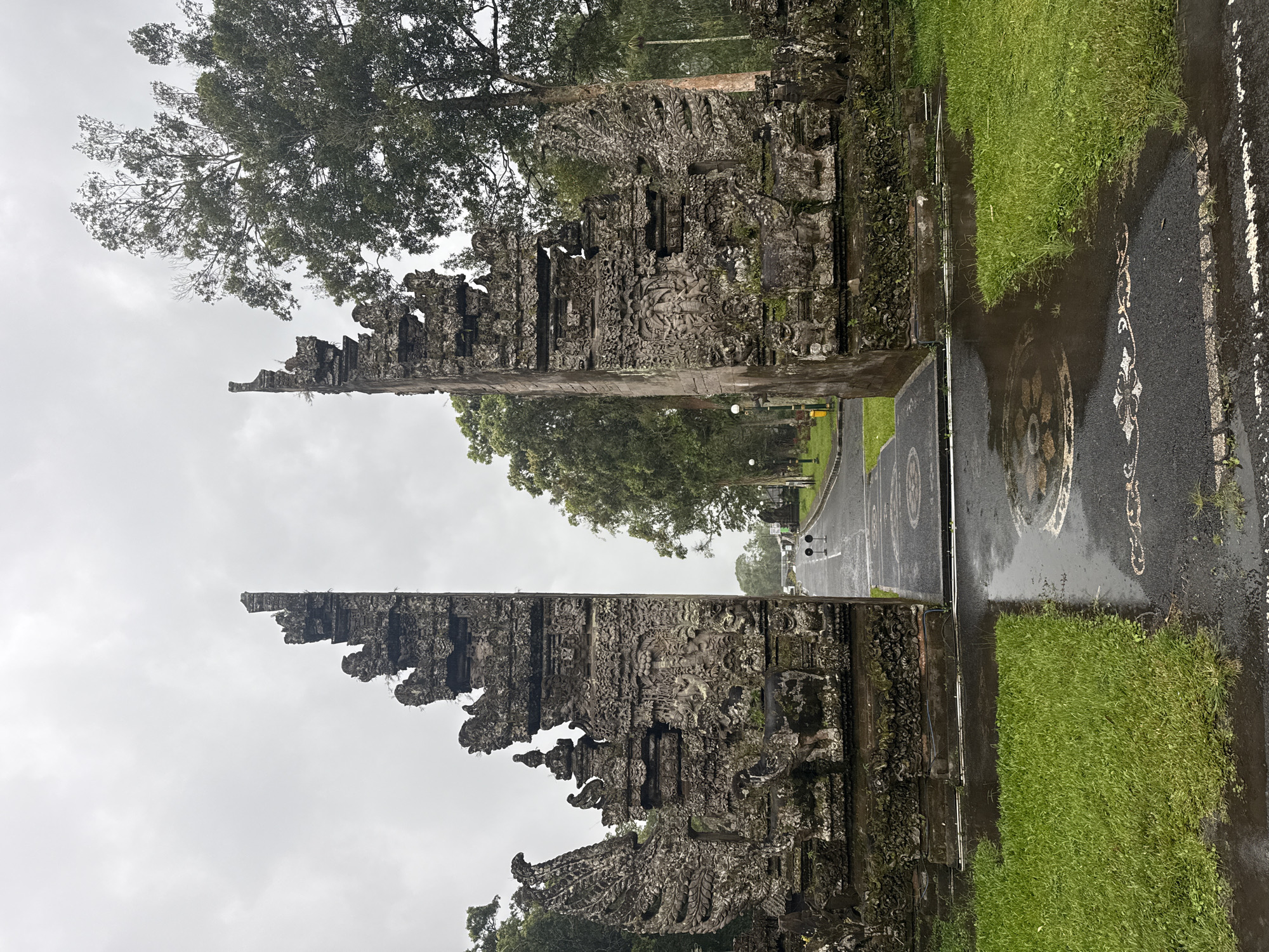The image captures the iconic Handara Gate in Bedugul, Bali, Indonesia, under overcast skies. The gate, constructed of dark, intricately carved stone, stands astride a paved roadway leading into the distance. The road is wet, reflecting light and revealing decorative patterns on its surface. Green grass grows adjacent to the road on either side. Trees fill the background.