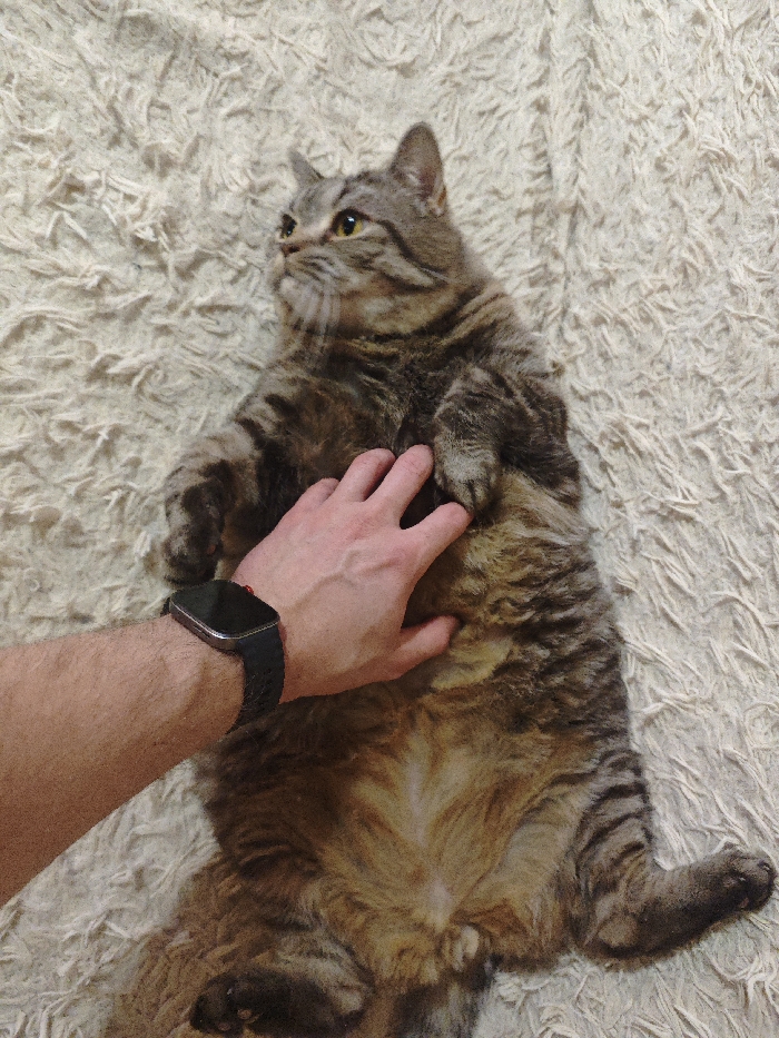 - "A domestic tabby cat, displaying brown, grey, and black striped fur with a lighter tan belly, lies on its back on a textured, light-colored, shaggy carpet" by FM-hxFsK2, licensed under CC BY 4.0