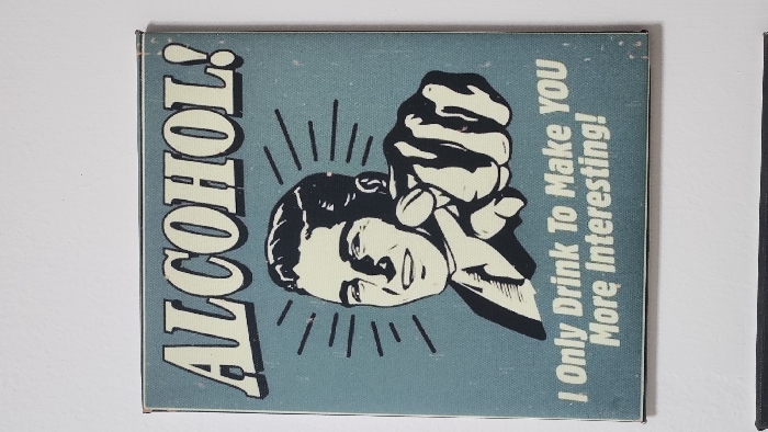 A rectangular graphic depicts a man in an advertisement. The word "Alcohol!" is vertically positioned on the left. The man, drawn in a vintage cartoon style, holds pills in his hand near his head. Lines emanate from his head. The text "I Only Drink To Make YOU More Interesting!" appears on the right. The background is a mottled light blue.