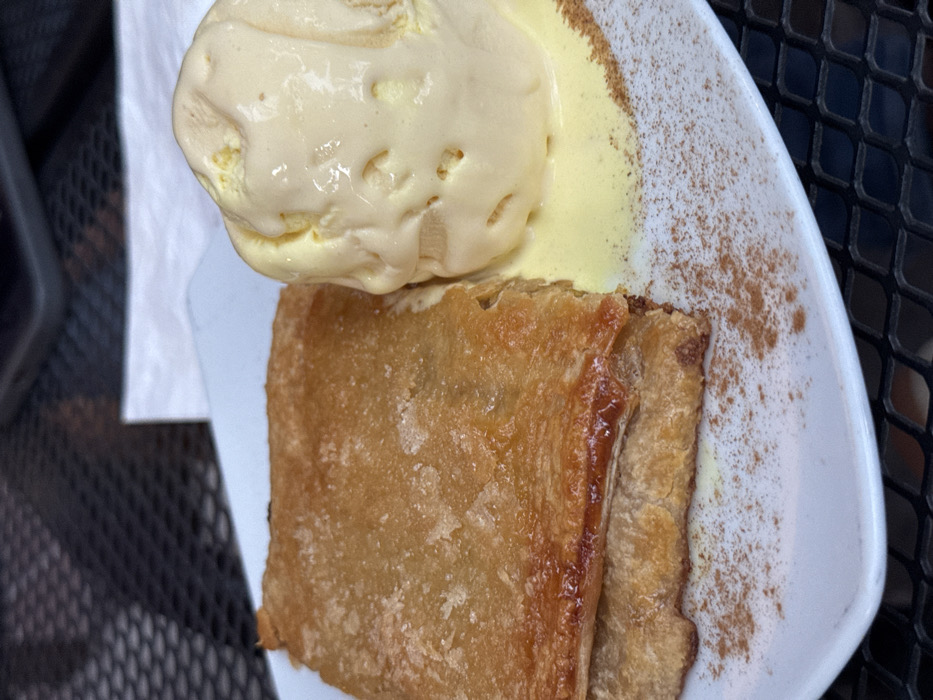 - "This image presents a dessert served on a white, rectangular plate, positioned on a dark, perforated metal table" by FM-TJ9mS2, licensed under CC BY 4.0