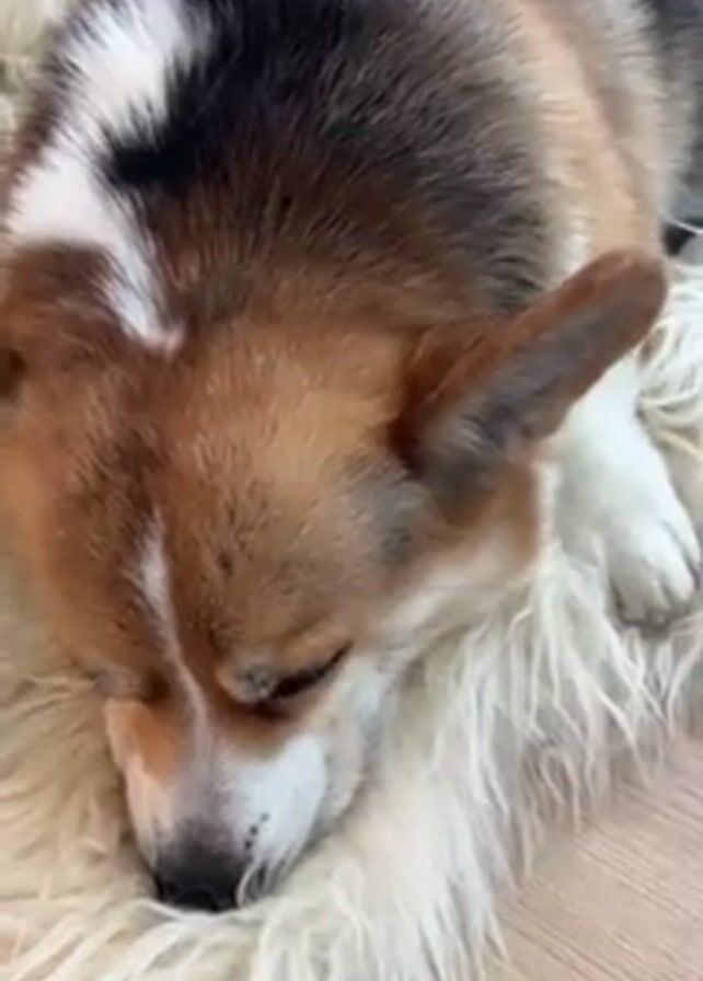 corgi dog resting on a white furry rug. The dog's head is facing downwards, and its eyes are closed. The dog is mostly brown, with a white stripe on its forehead and some black fur on its back. The rug is on a wooden floor. There is sound from a TV playing in the background.