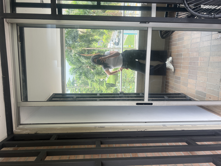 The image displays a mirror selfie of a female subject, approximately 20-30 years old, reflected in a closed, silver-framed glass sliding door that leads to an outdoor balcony