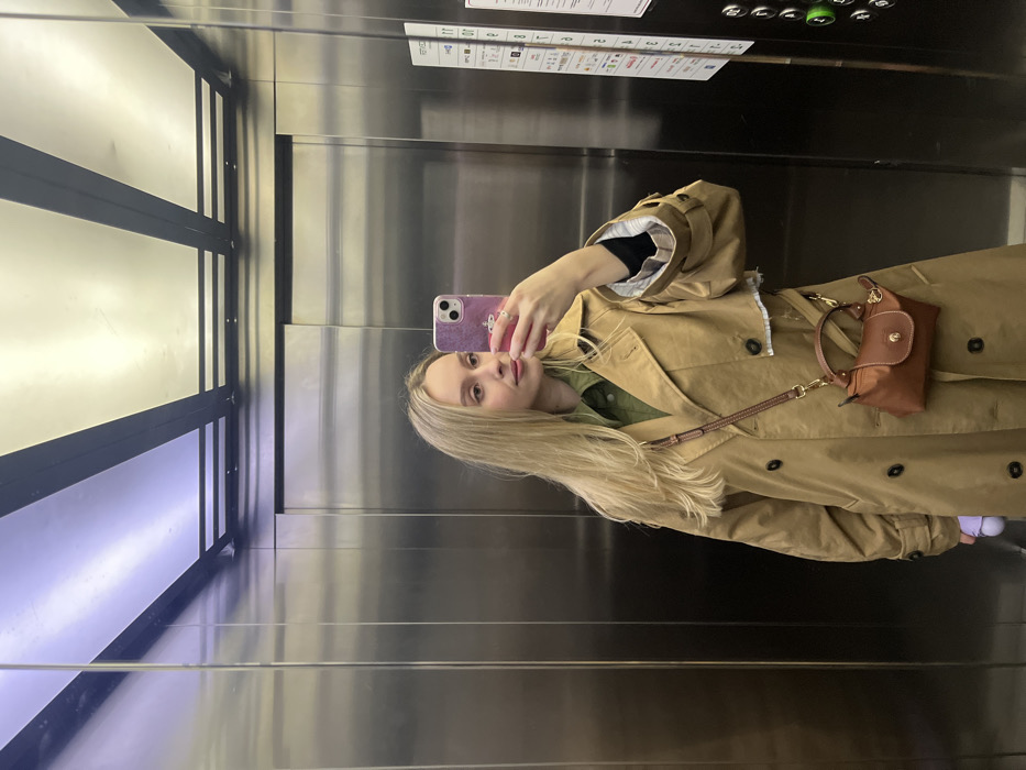 A young adult female is depicted taking a mirror selfie inside a brushed stainless steel elevator car. The woman, with long, straight, blonde hair, wears a tan trench coat over an olive green collared shirt. The trench coat features exposed buttons, a frayed horizontal hemline across the chest, and rolled-up sleeves revealing a checkered pattern lining. She carries a small brown leather crossbody handbag with a top handle and a prominent front flap closure. In her right hand, she holds a smartphone, identifiable as an iPhone, encased in a sparkly purple case with an attached ring holder. A ring is visible on her right ring finger. A light purple bottle is partially visible near her left hip. The elevator interior features brushed stainless steel panels on the walls and doors, with a metallic ceiling incorporating recessed lighting and black structural elements. On the right side of the elevator, a control panel is visible, featuring multiple circular buttons, some illuminated green. Above the buttons, a vertical informational sign displays Cyrillic text, including "РЕТУШ" (Retouch) at the top, followed by icons representing beauty services (scissors, nail polish, massage, eye) and associated pricing denoted in Belarusian Rubles (BYN), such as "BYN 10." This textual evidence indicates the location is a commercial building in Minsk, Belarus, likely a beauty salon or a facility offering similar services.